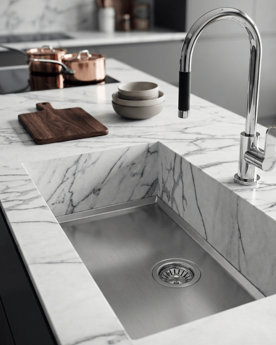 Phantom is not simply a sink; it is an invitation to pure architecture. As a stainless-steel base designed to integrate under natural stone, granite, marble, or solid surfaces, it allows the countertop to flow without interruption. The result is a sink that appears to have been sculpted directly from a block of stone, while maintaining the unmatched hygiene and durability of steel at its base.